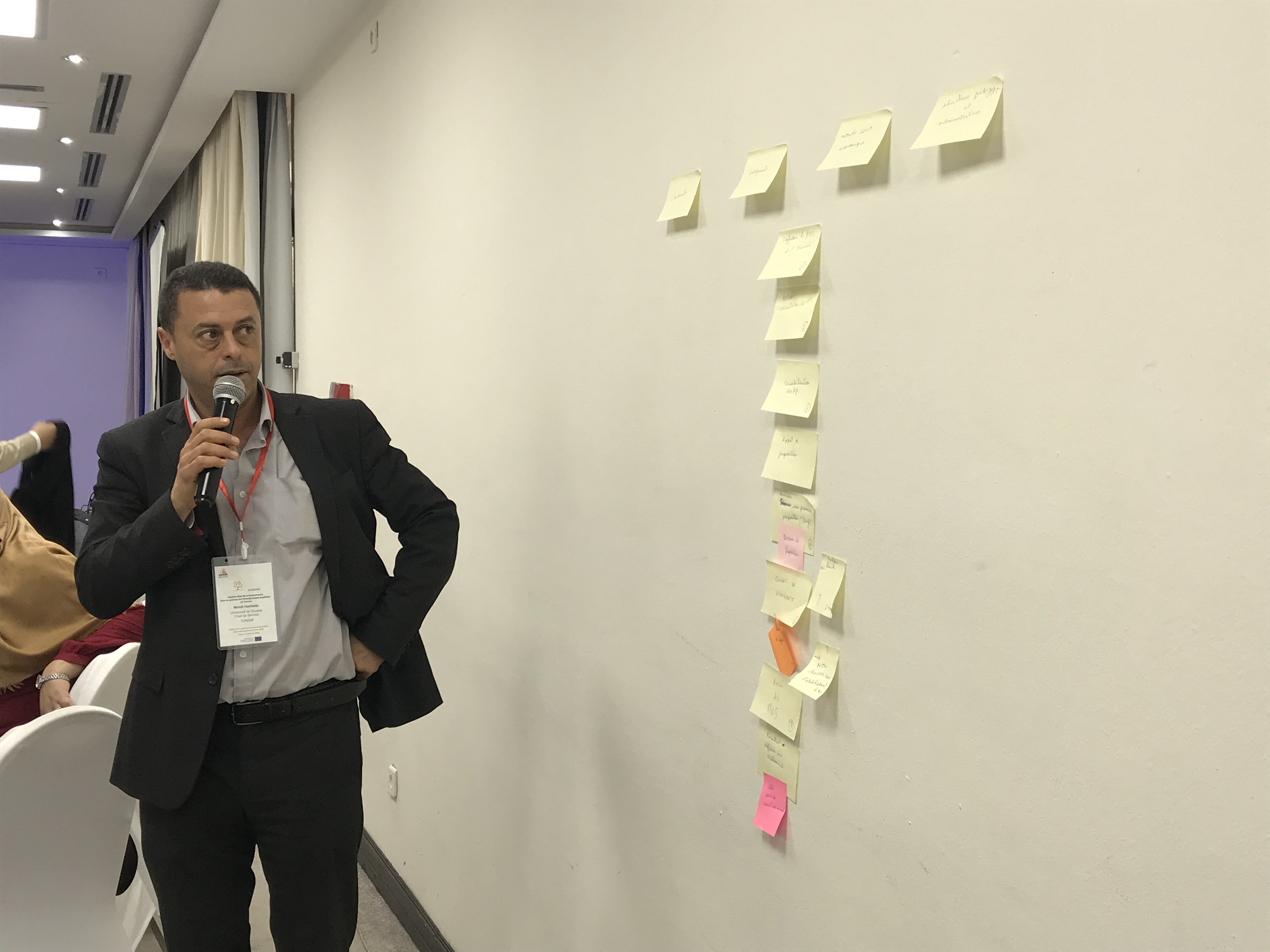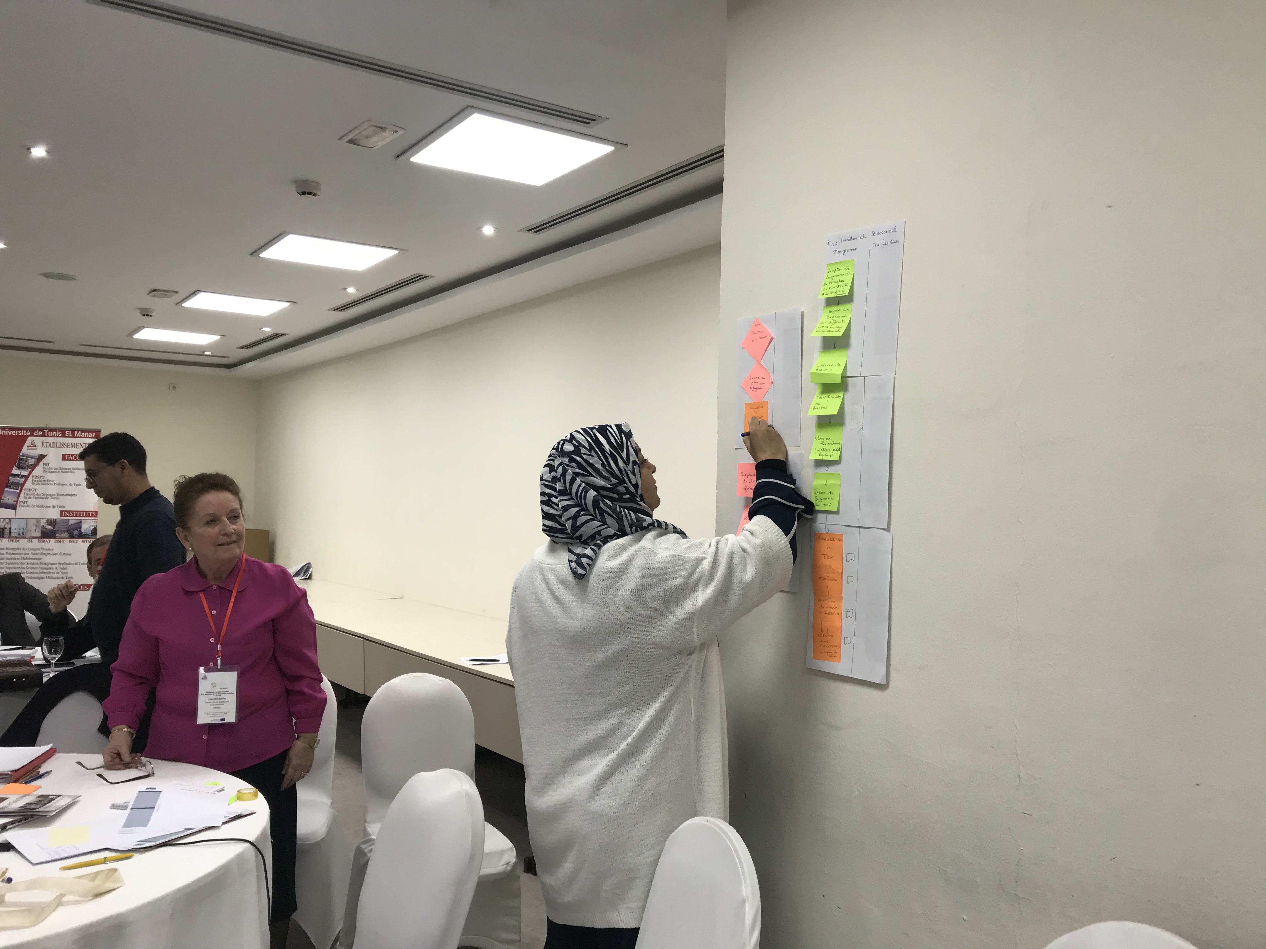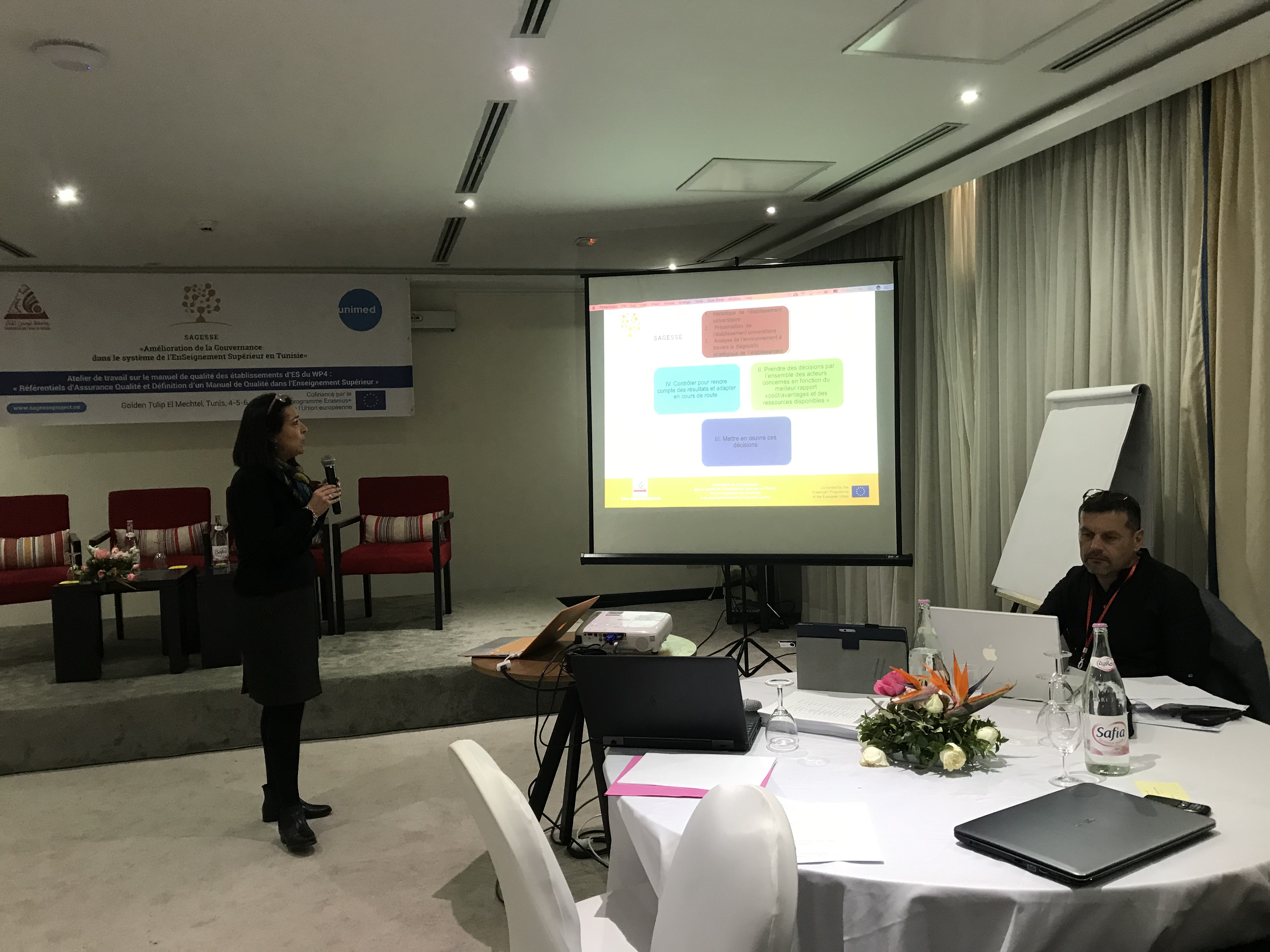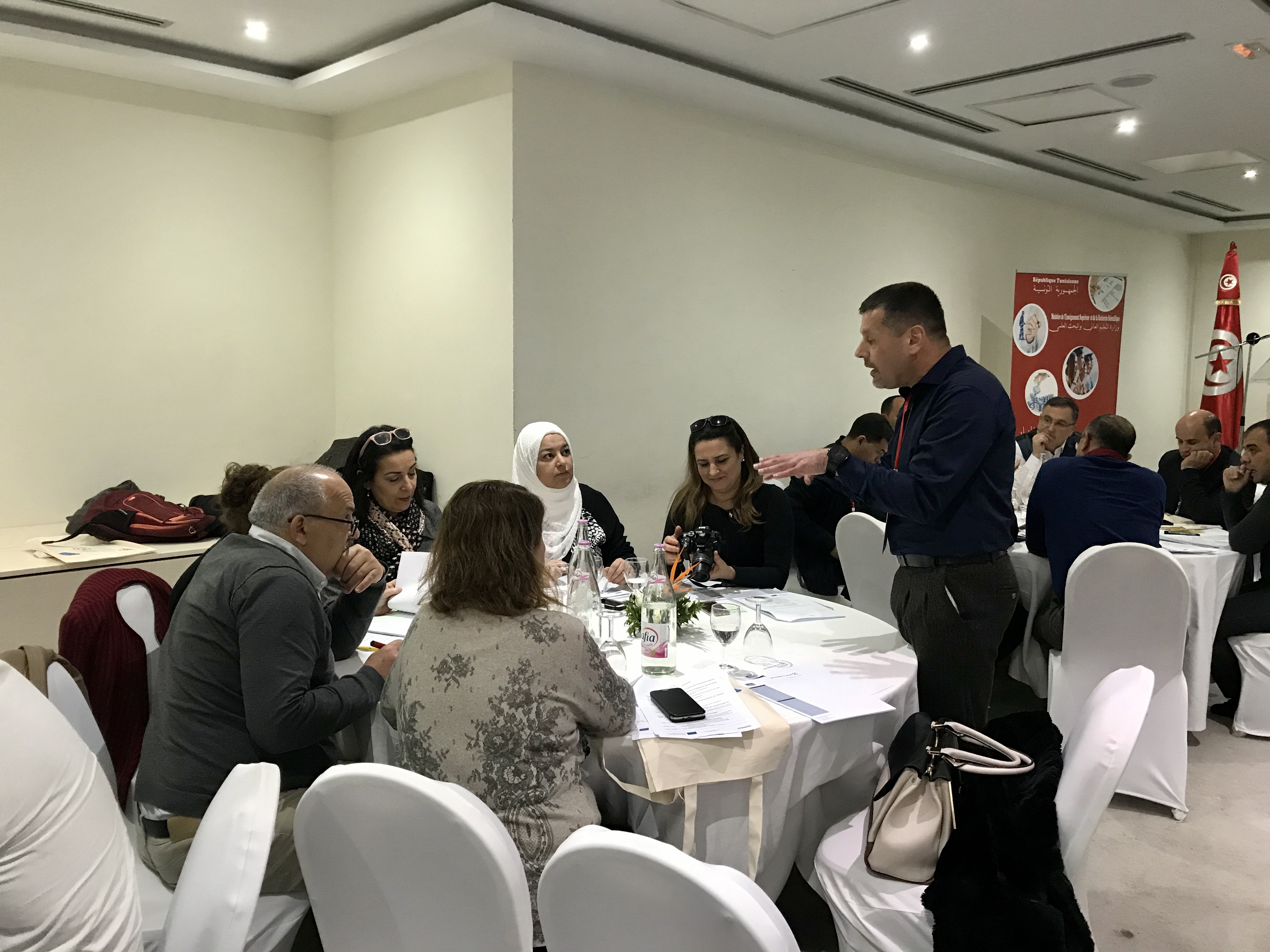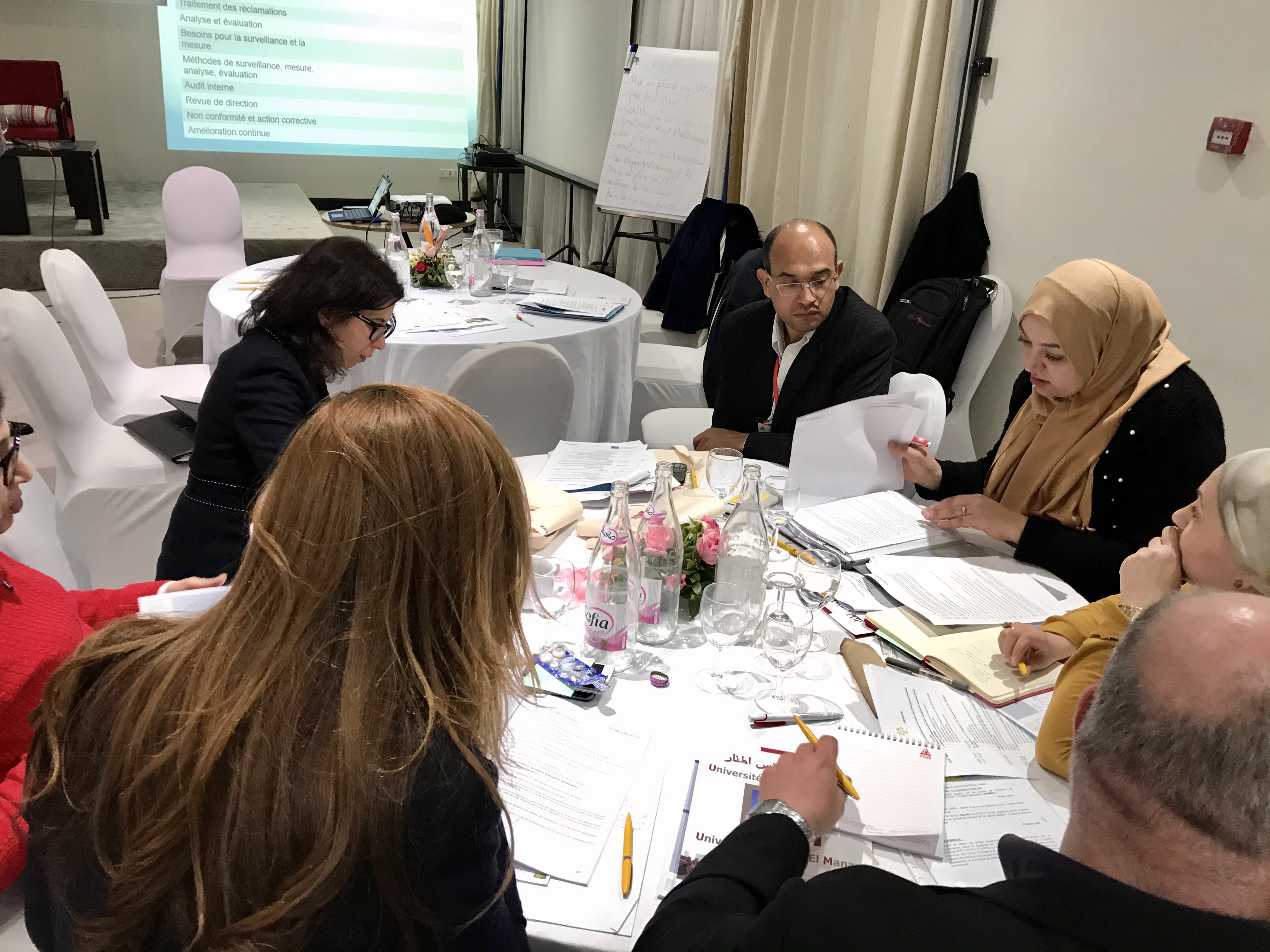 الجودة في التعليم العالي "وقد تناولت عدة مواضيع تعلقت بضمان الجودة، من مراقبة الجودة إلى نظام إدارة  الجودة. وقد سير الورشة خبيران من خارج الفريق، وهما السيدان ستيفان كولون من آكس جامعة مرسيليا،  بصفته خبيرا في إدارة الجودة، والسيدة سارة الغربي مدققة حسابات معتمدة ألنظمة اإلدارة، ومقي مة لدى منظمة  االعتماد التونسية ـ المجلس الوطني لالعتماد. وتم بهذه المناسبة، إجراء تمارين ودراسات عملية من قبل جميع  المشاركين. حدد جميع المشاركين المسارات ، ونظام إدارة الجودة الموحد في كل الجامعات، في شكل خرائط  مع تحديد ال توجهات االستراتيجية، ووضع دليل اإلجراءات، ودليل الجودة في الجامعات التونسية. وقد تقاسمت  كل الجامعات المشاركة أفضل الممارسات والتوجيهات فيما يتعلق بضمان الجودة، وإدارة الجودة بما في ذلك  المعايير االفريقية والمعايير األوروبية ومعيار المنظمة الدولية لتوحيد المقاييس 21001 .وقد تم التحقق من  صحة نموذج دليل الجودة واإلجراءات من أجل تحسين مالءمة الحوكمة على المستوى الوطني. وللسبب نفسه،  تم تقديم ثالث خطط عمل من قبل جامعات تونس المنار، والمنستير، وقابس، إليجاد المحاور الرئيسية  المشتركة لحوكمة رشيدة حسنة موحدة