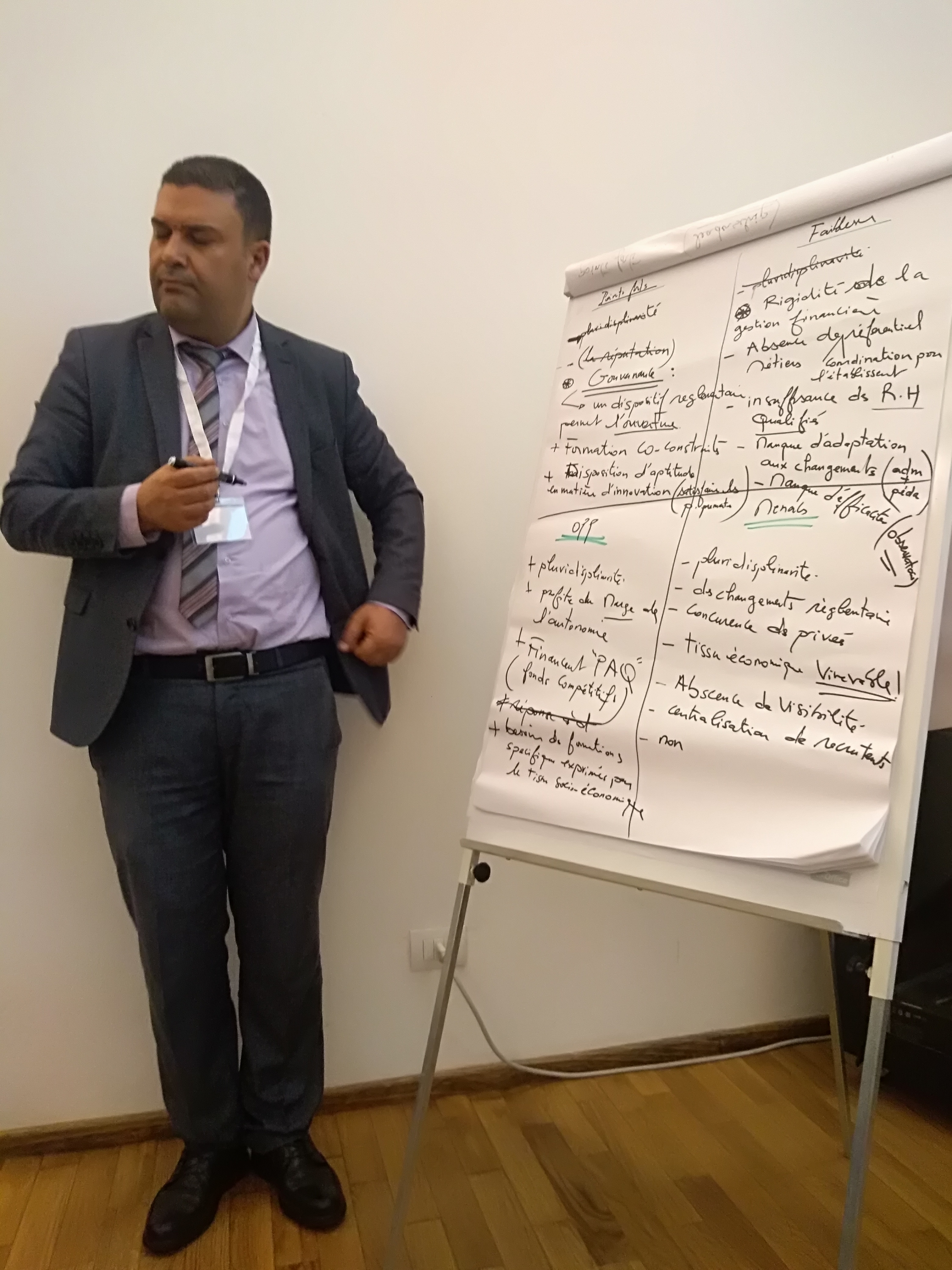 Le quatrième jour a vu la participation conjointe du Prof. Gianluca Senatore de l’Université La Sapienza de Rome et du Dr. Mounir Ben Achour de l’lnstance nationale de l’Evaluation, de l’Assurance Qualité et de l’Accréditation – IEAQA, qui ont présenté le thème de l’Évaluation et de l’Assurance qualité dans l'enseignement supérieur. Nous avons parlé de mise en place d’un système de management de la qualité ainsi que d’auto-évaluation périodique des activités universitaires. D’un côté le Prof. Senatore a expliqué le système d’évaluation italien AVA et le travail de l’agence nationale chargée de l’assurance qualité ANVUR ; de l’autre côté le Dr. Ben Achour a exposé l'Assurance Qualité et le processus d'évaluation des établissements d'enseignement supérieur adopté par l'instance Tunisienne de l'évaluation (IEAQA) en examinant un cas pratique d'évaluation d'un établissement selon le référentiel IEAQA. Pour plus d’informations veuillez télécharger la 4_Présentation Sienne_SapienzaPrésentation du Prof. Gianluca Senatore et la 4_Présentation Sienne_IEAQAPrésentation du Dr. Ben Achour