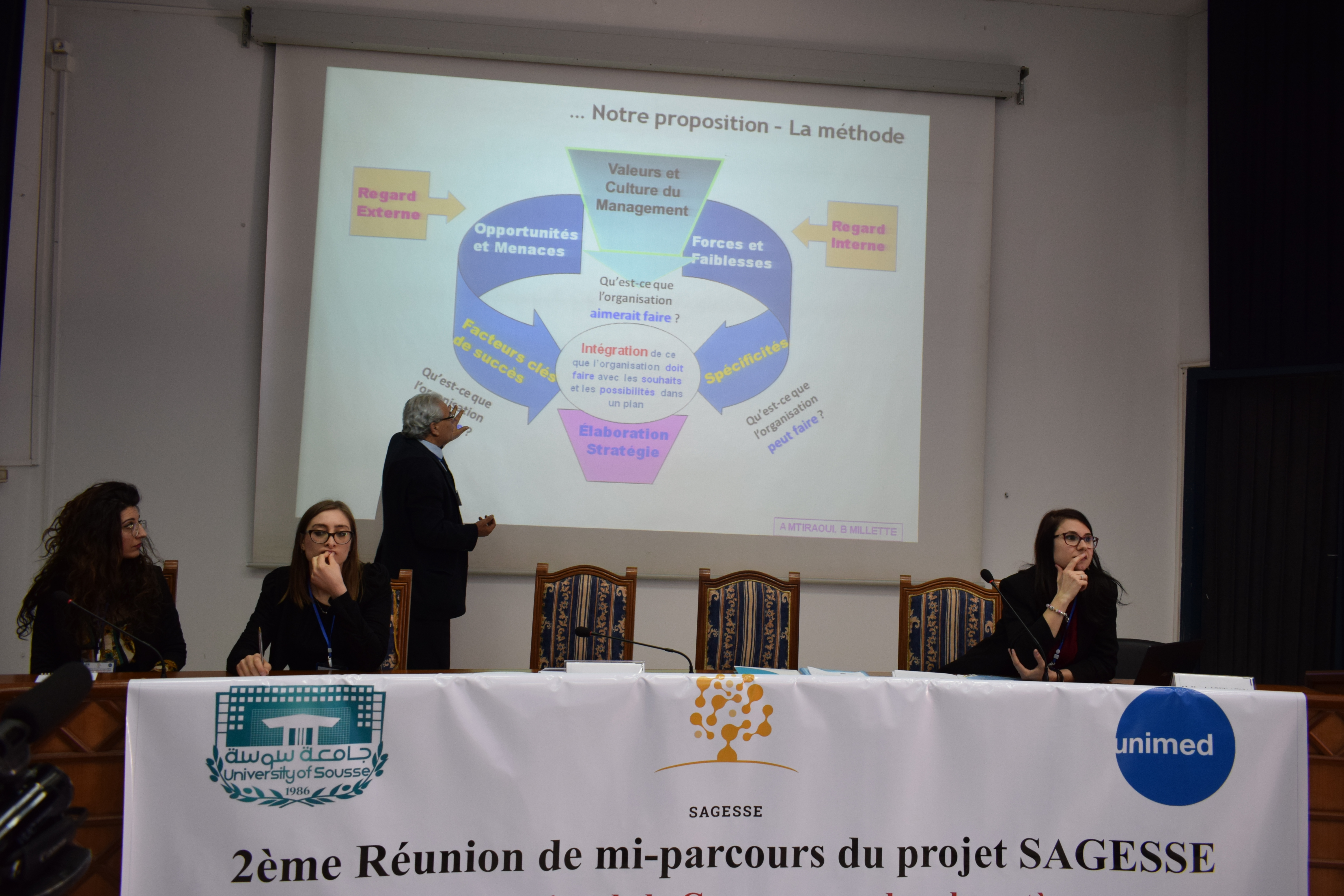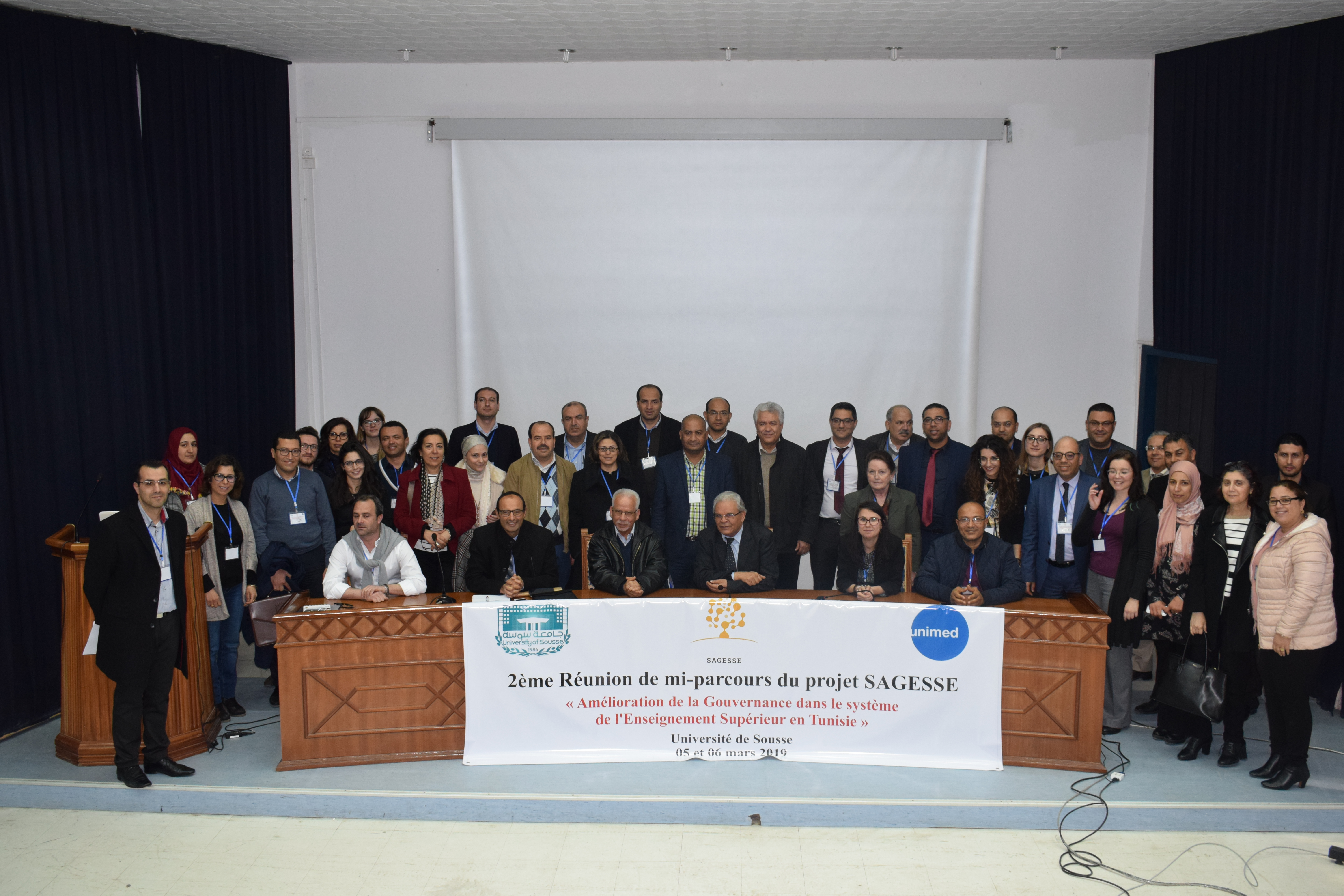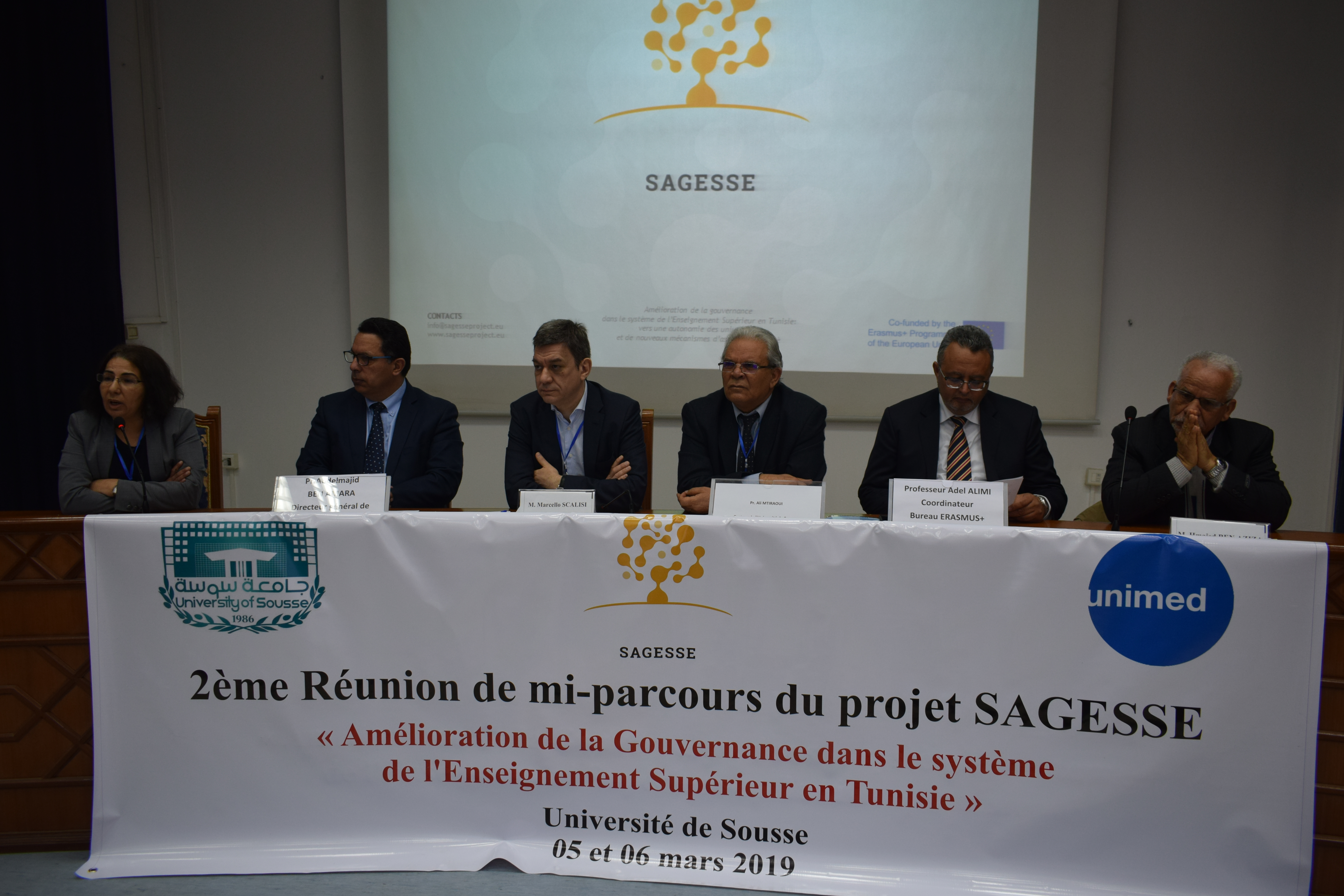 Les 5 et 6 mars 2019, à Sousse (Tunisie), le président de l’Université de Sousse, prof. Ali Mtiraoui, le vice-doyen de la faculté de médecine, prof. Olfa Bouallègue, le directeur de la division de la coopération internationale du ministère de l’Enseignement supérieur et de la Recherche scientifique en Tunisie, prof. Ben Ammara, le coordinateur du bureau national Erasmus Plus, prof. Adel Alimi, le secrétaire général de l’UNIMED, prof. Hmaid Ben Aziza et le directeur de l’UNIMED, M. Marcello Scalisi, ont accueilli 60 participants tunisiens (des 13 universités publiques, du ministère de l’Enseignement supérieur et de la Recherche scientifique et de l’Agence tunisienne d’assurance de la qualité et de l’évaluation) et des partenaires européennes (de l’Université de Sienne, de l’Université Sapienza de Rome, de l’Université de Barcelone, de Paris 1 Panthéon Sorbonne et CESIE) pour la 2e réunion de gestion à mi-parcours du projet SAGESSE, coordonné par l’UNIMED.