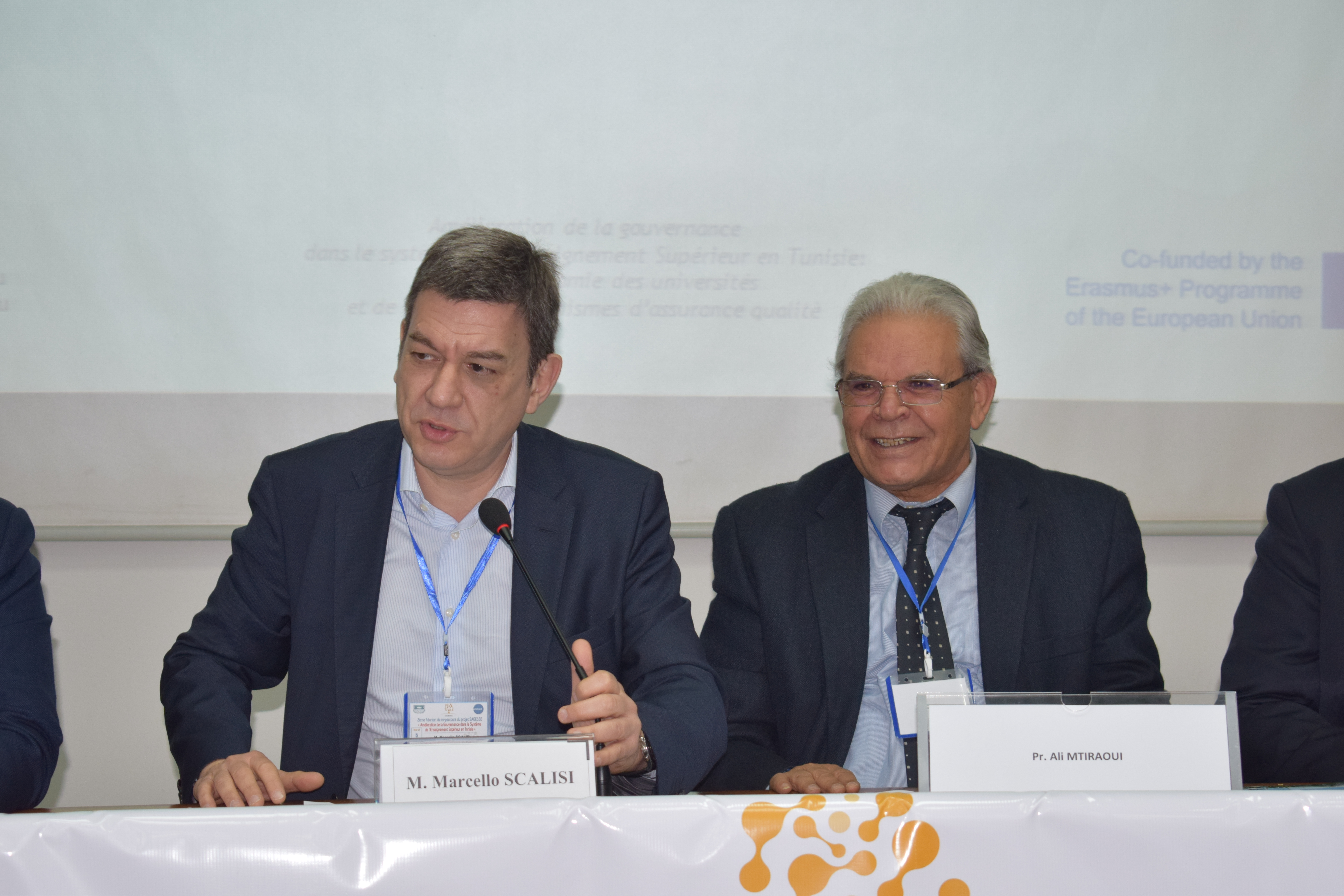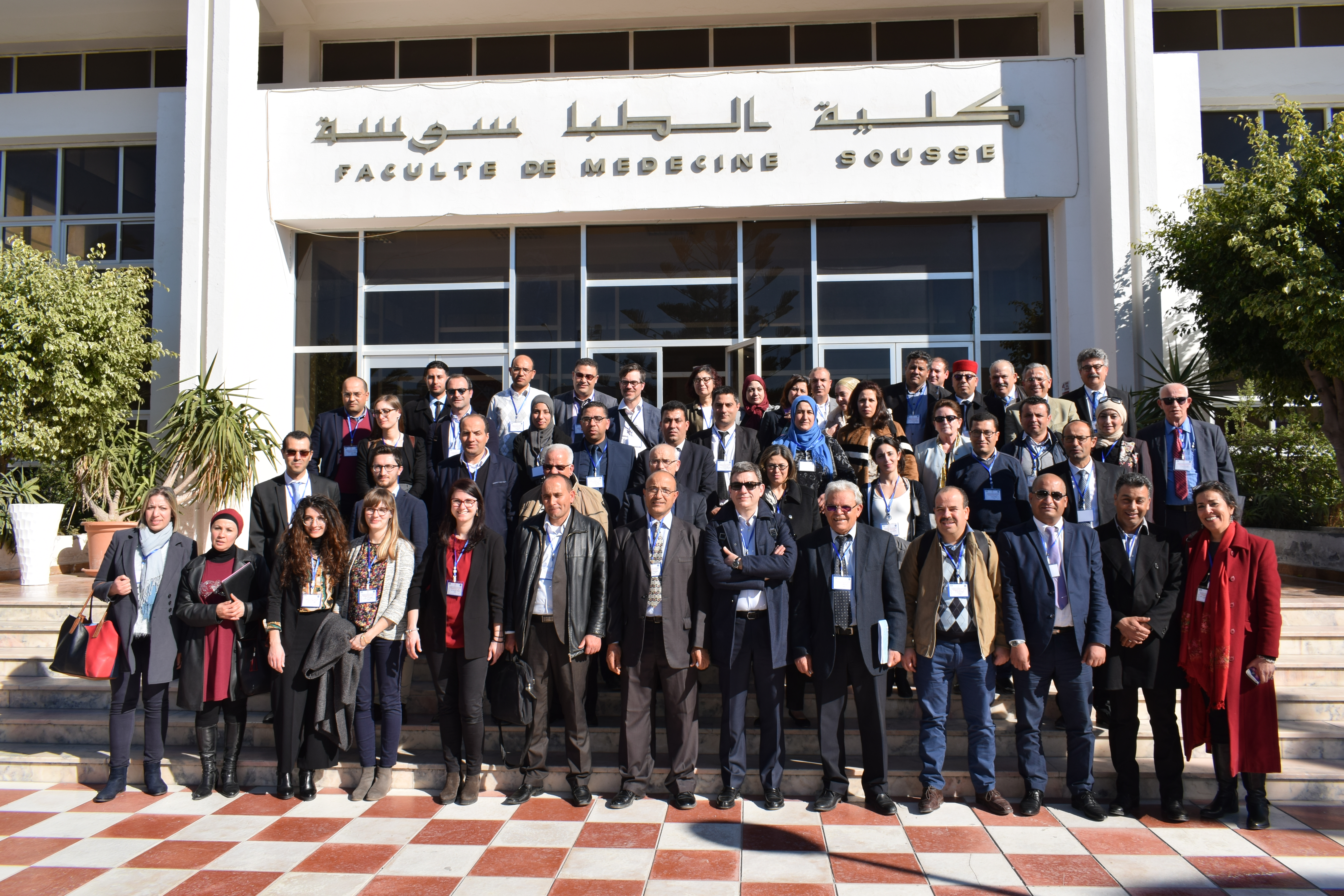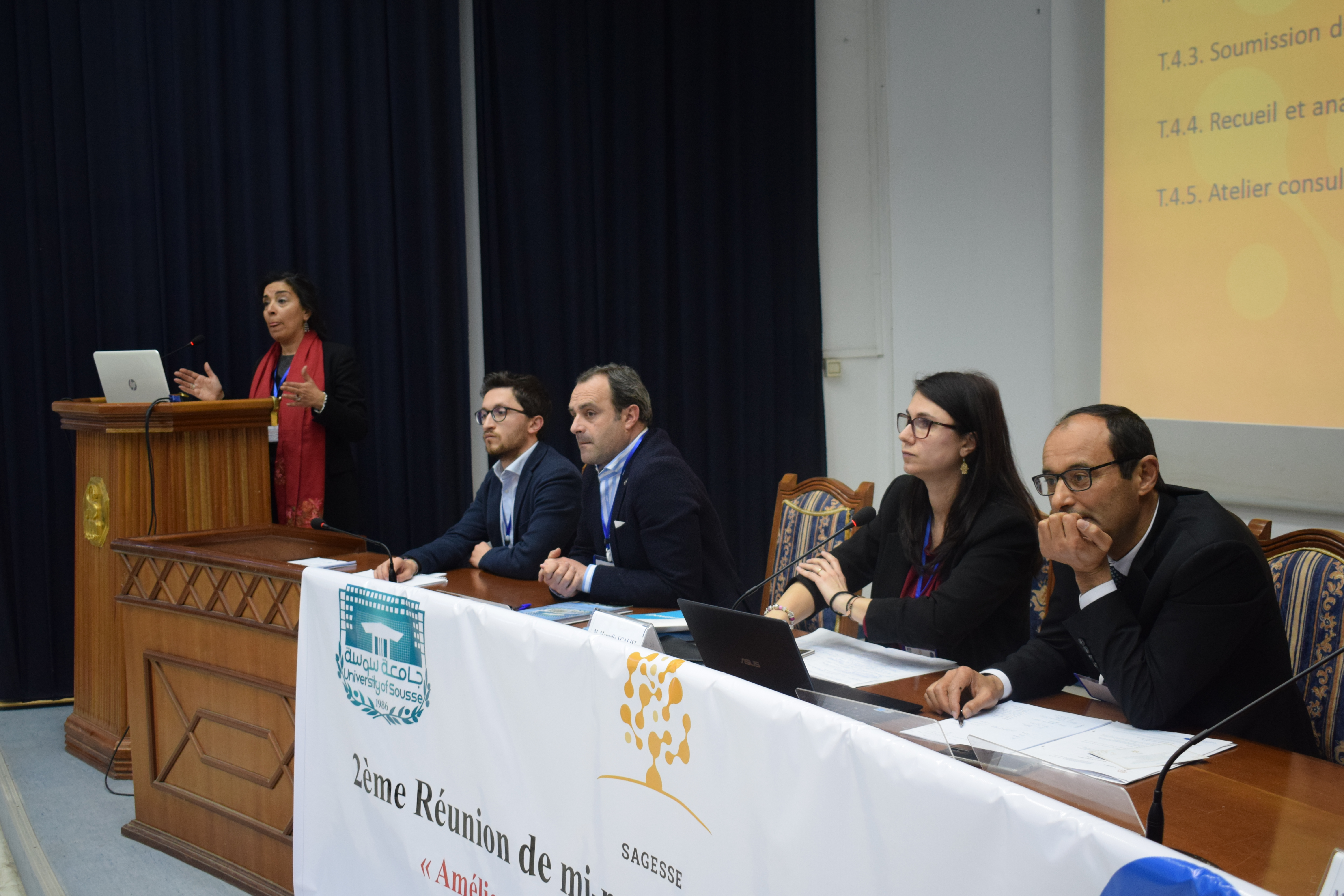 Les 5 et 6 mars 2019, à Sousse (Tunisie), le président de l’Université de Sousse, prof. Ali Mtiraoui, le vice-doyen de la faculté de médecine, prof. Olfa Bouallègue, le directeur de la division de la coopération internationale du ministère de l’Enseignement supérieur et de la Recherche scientifique en Tunisie, prof. Ben Ammara, le coordinateur du bureau national Erasmus Plus, prof. Adel Alimi, le secrétaire général de l’UNIMED, prof. Hmaid Ben Aziza et le directeur de l’UNIMED, M. Marcello Scalisi, ont accueilli 60 participants tunisiens (des 13 universités publiques, du ministère de l’Enseignement supérieur et de la Recherche scientifique et de l’Agence tunisienne d’assurance de la qualité et de l’évaluation) et des partenaires européennes (de l’Université de Sienne, de l’Université Sapienza de Rome, de l’Université de Barcelone, de Paris 1 Panthéon Sorbonne et CESIE) pour la 2e réunion de gestion à mi-parcours du projet SAGESSE, coordonné par l’UNIMED.